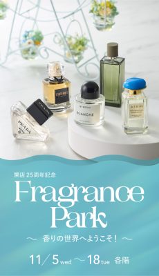 開店25周年を記念した「Fragrance Park ~香りの世界へようこそ! 〜」では、化粧品売場やイベントスポットなどを中心に、ファッションの一部として秋冬に纏いたい香りのフレグランスをご紹介。その日の気持ちや装いの印象を心地よく変える、自分に合う1本がきっと見つかるイベントです。