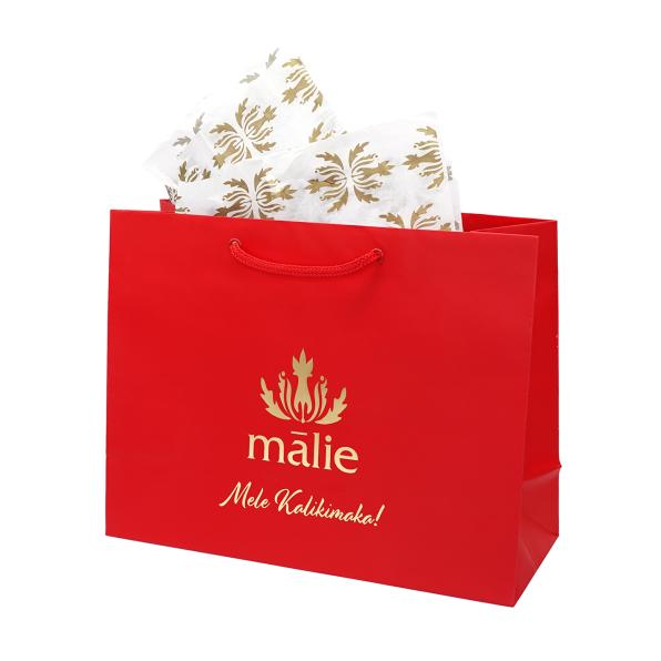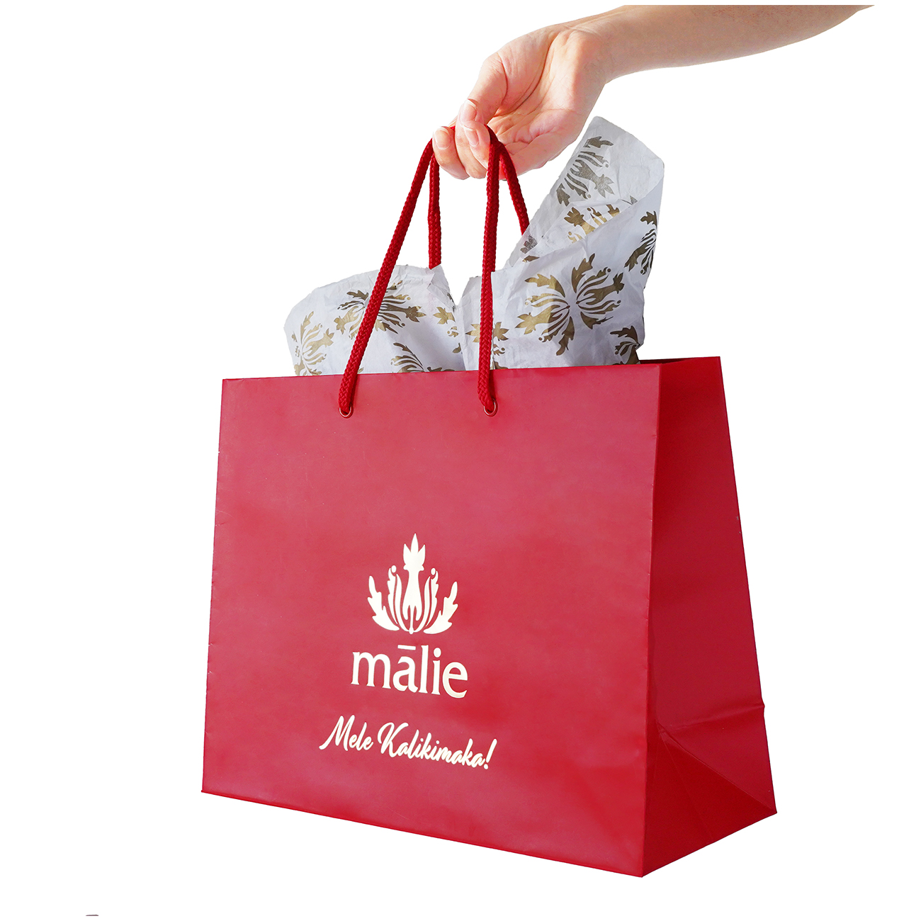 ロゴの入ったシーズン限定の赤いブランドオリジナルショッパーは、ハワイ語で「メリークリスマス」のメッセージ入り。同じくMalieロゴがプリントされた華やかな薄紙をセットにしました。