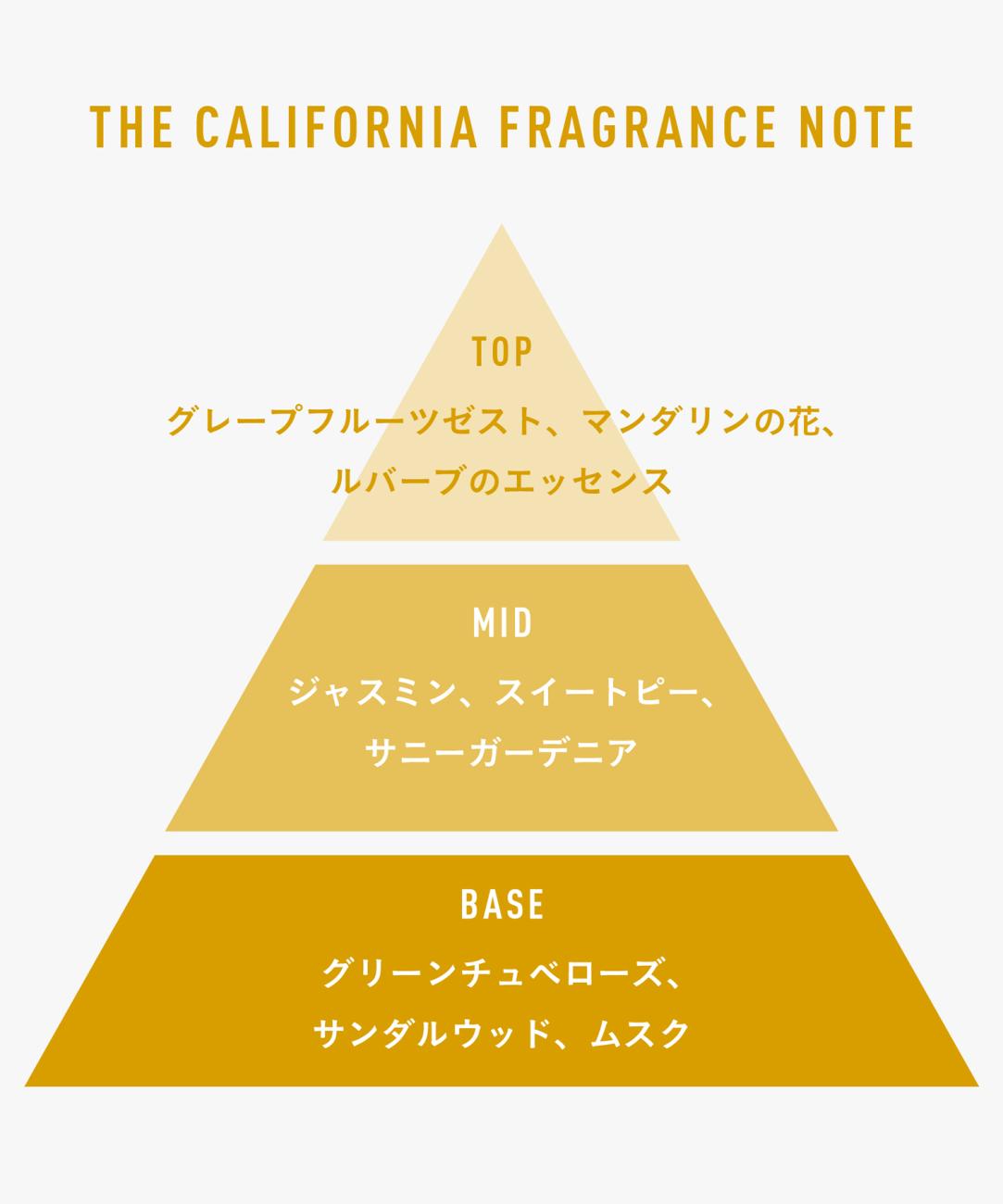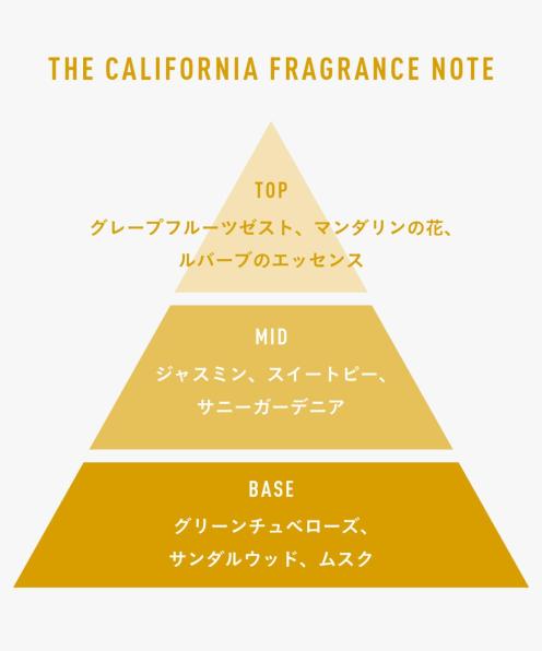 トップノート:グレープフルーツゼスト、マンダリンの花、ルバーブのエッセンス