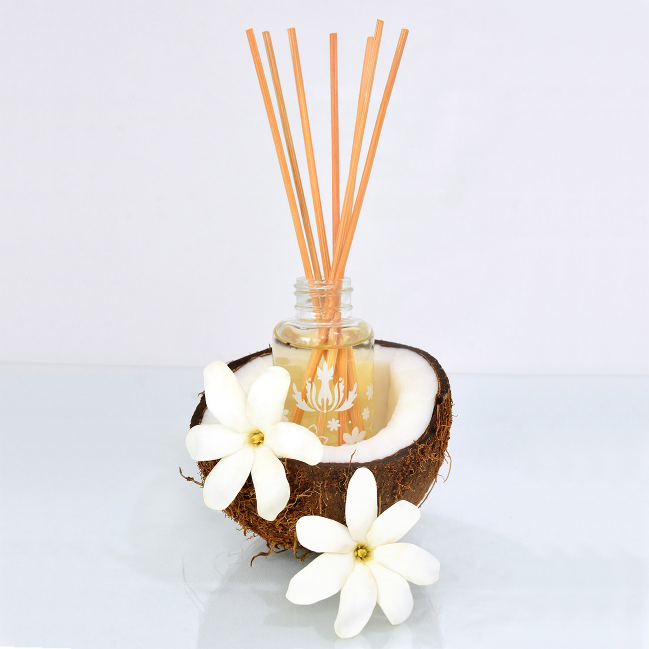 アルコールは一切使用せず、純粋なパフュームオイルのみを使用。天然のリード(葦・アシ)が香りのオイルを吸い上げることにより柔らかでトロピカルな香りがお部屋に広がります。ハワイのアロマセラピーで穏やかでリラックスした気分に浸ってください。